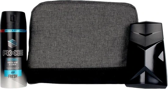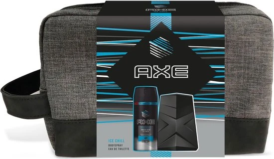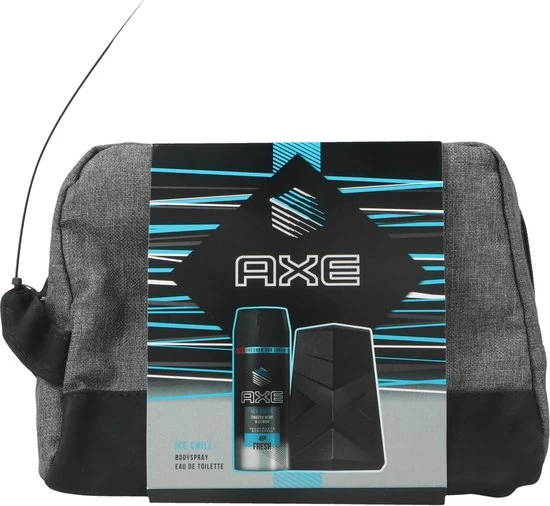 De Ice Chill geschenkset bevat een 100 ml Ice Chill eau de toilette en een 150 ml Deodorant Bodyspray, verpakt in een toilettas van AXE.
