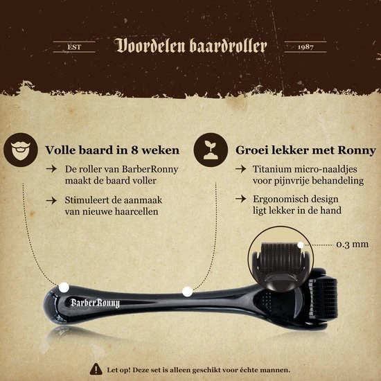 De baardroller van BarberRonny™ maakt de baard binnen 8 weken voller. Dit gebeurt door het aanmaken van nieuwe haarcellen en het activeren van ”dode” haarcellen. De Titanium micro naaldjes zorgen voor een pijnvrije behandeling en de roller ligt lekker in de hand. De 540 titanium naaldjes creëren microscopische wondjes waardoor de bloedcirculatie en slapende haarfollikels worden gestimuleerd. Gebruik i.c.m. van de verzorgende olie en balsem en je groeit lekker door met BarberRonny!