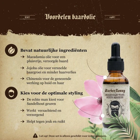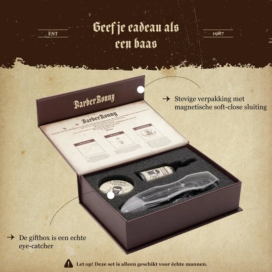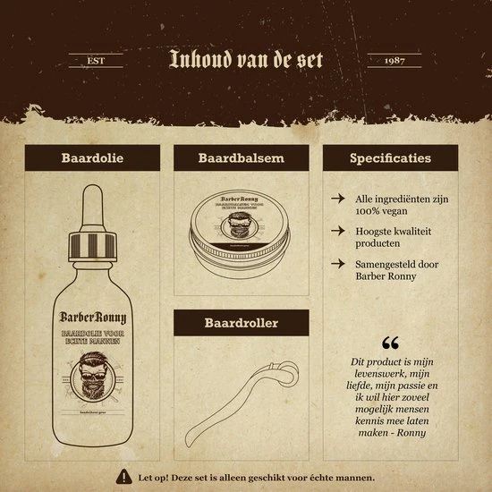Tuurlijk van oudsher is het als man zijnde misschien een beetje gek om veel met de verzorging van jezelf bezig te zijn. Maar laten we eerlijk zijn….. anno 2021 verzorgen echte mannen zichzelf goed. En mooie vrouwen vallen op echte mannen. Cirkeltje rond! BarberRonny is er voor jou! Deze Baard Bazen Groei Set is daarom met grote zorg ontwikkeld en uitvoerig in de BarberShop getest. Pas nadat Ronny blijvend resultaat zag bij veel van zijn trouwe klanten hebben wij ervoor gekozen dit product ook echt op de markt te brengen. Je hoort het goed, dit is werkelijk waar een volwaardige set welke ook in BarberShops in Nederland wordt gebruikt. Enkel en alleen de meest hoogwaardige kwaliteit.