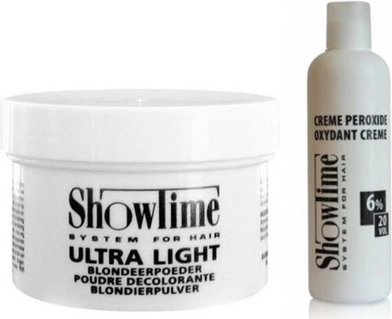 Showtime Blondeerpoeder Ultra Light is een prima kwaliteit ontkleuringspoeder. Deze blondeerpoeder dien je te mengen met de Showtime Oxidatiecreme Gebruik: Meng de Blondeerpoeder met Waterstofperoxide. De sterkte van de Peroxide 3,6,9 of 12% is afhankelijk van het gewenste resultaat. Je mengt het tot een lekker smeerbaar papje wat geen klontjes geeft. Vermijd met het inzetten zoveel mogelijk de huid.