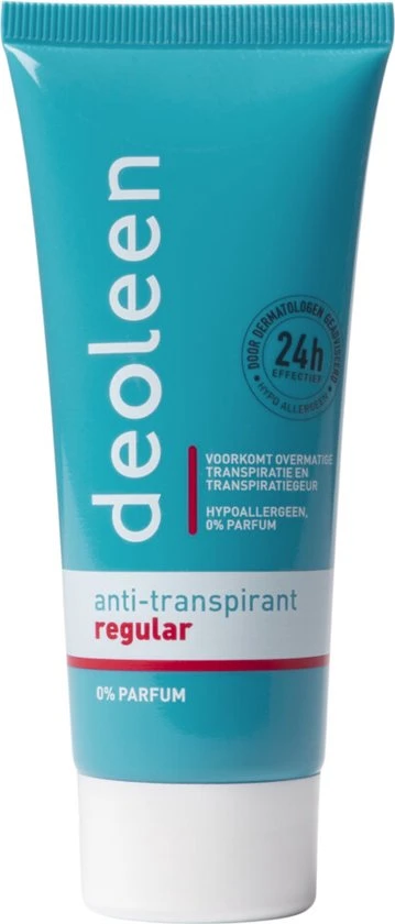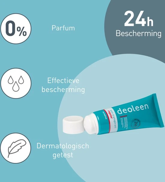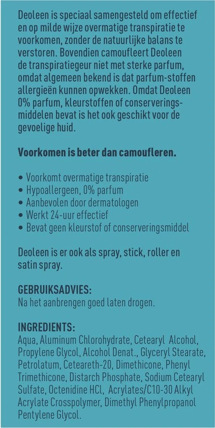 Deoleen Regular Crème is speciaal samengesteld om effectief en op milde wijze overmatige transpiratie te voorkomen, zonder de natuurlijke balans te verstoren. Deoleen camoufleert de transpiratiegeur niet met sterke parfum, aangezien parfumstoffen allergieën kunnen opwekken. In plaats daarvan neutraliseert Deoleen de transpiratiegeur door ongewenste bacteriegroei te voorkomen. Deoleen, voorkomen is beter dan camoufleren.