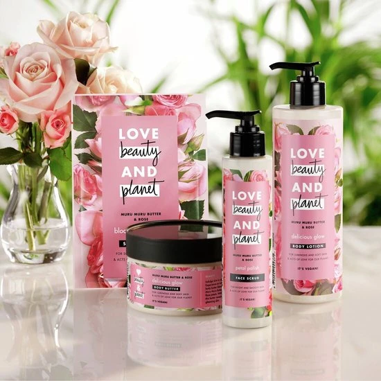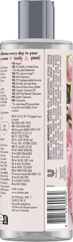 Love Beauty and Planet Muru Muru Butter & Rose Bountiful Moisture showergel geeft liefde en hydratatie aan aan een droge huid en zorgt voor een stralende huid die zacht en glad aanvoelt. Deze hydraterende douchegel is gemaakte met ingrediënten van natuurlijke en duurzame oorsprong, zoals biologische muru muru-boter en de heerlijke geur van handgeplukte rozenblaadjes uit de Rozenvallei in Bulgarije. Bij Love Beauty and Planet geloven we in effectieve natuurlijke verzorgingsproducten, ofwel in beauty zonder concessies. Vanaf nu kun je met elke douche een klein verschil maken voor de planeet. Zo zijn al onze flessen gemaakt van 100% gerecycled plastic en zijn ze volledig recyclebaar. De formule van deze showergel is bovendien voor 97% biologisch afbreekbaar en bestaat voor 92% uit ingrediënten van natuurlijke oorsprong (de overige 8% is om de kwaliteit en veiligheid van het product te garanderen). Goed voor jou, en goed voor de planeet. Je weet hoe het werkt: knijp in de fles, geniet van het schuim en spoel af. Gebruik niet meer water dan nodig. Voor de ultieme verzorging gebruik je vervolgens de Love Beauty and Planet Muru Muru Butter & Rose Delicious Glow bodylotion voor een zijdezachte huid. Probeer ook ons assortiment haarverzorgingsproducten met onze Muru Muru Butter & Rose shampoo en conditioner voor glanzend en gezond haar. Onze producten zijn verkrijgbaar in 6 heerlijk ruikende lijnen met ingrediënten van natuurlijke oorsprong zoals biologische kokosolie, muru muru-boter, rozenolie, ylang ylang, sheaboter en eucalyptus. Love Beauty and Planet combineert verzorgingsproducten met Small acts of Love voor de planeet. We werken hiervoor samen met duurzame lokale ondernemers die zich, net als wij, inzetten voor het hergebruik van materialen. Zo zetten we samen een mooie beweging in gang. Doe je mee?
