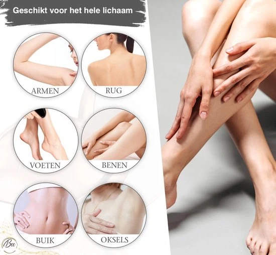 - Geschikt voor de meeste delen van het lichaam: De haarverwijderaar kan veilig worden gebruikt op enkels, armen, benen, borst en rug. Wij raden echter aan om niet te frequent te gebruiken of te hard wrijven. Als je een gevoelige huid hebt, probeer het dan eerst op je armen/benen voordat je het op andere gevoelige plaatsen gebruikt.