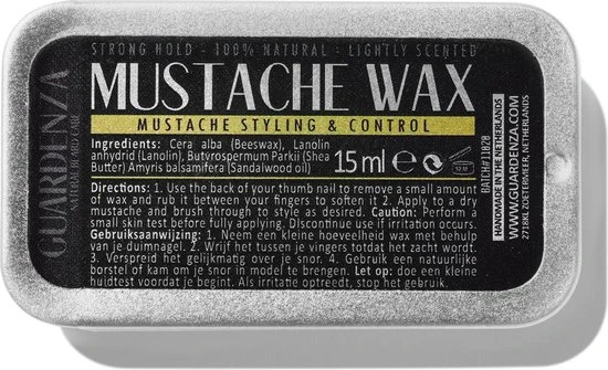 Guardenza snorrenwax is een styling wax met een sterke hold, om je snor perfect in model te brengen en te fixeren. Je kunt het Ideaal gebruiken voor het stijlen van bijvoorbeeld een ‘handlebar’ snor of simpelweg een natuurlijke ‘look’. Deze wax zal ook je snor trainen om in de gewenste positie te blijven. Met dit compacte schuifblikje, zul je altijd in staat zijn om je snor, waar je ook bent, gemakkelijk bij te werken.