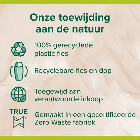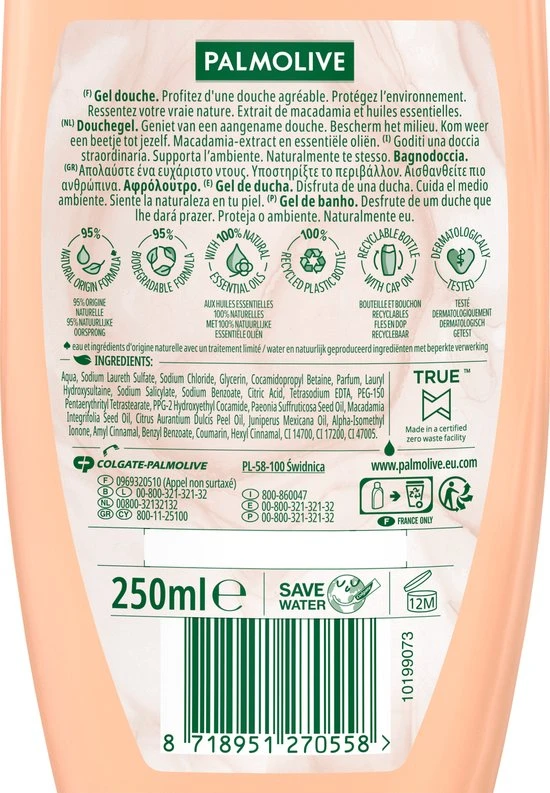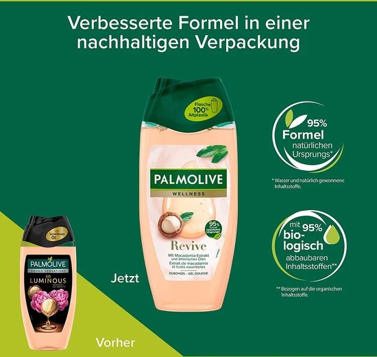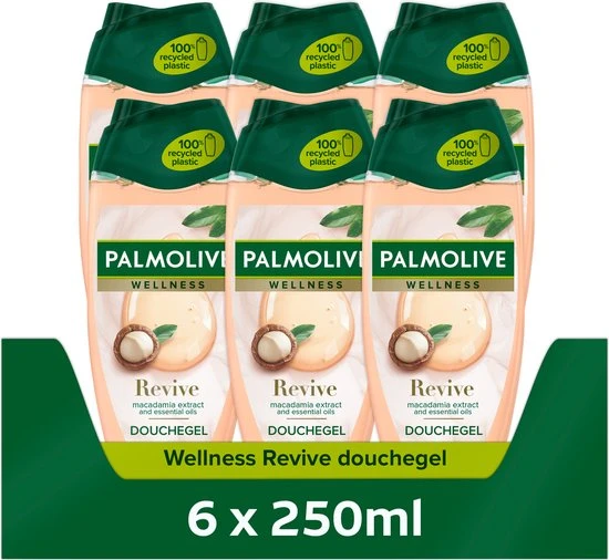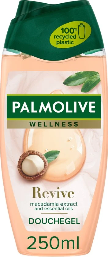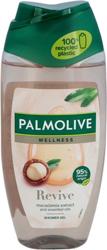 Voel je verbonden met de natuur en geef je huid een verjongingskuur dankzij Palmolive Wellness Revive douchegel. Onze body wash is geïnspireerd door de natuur en heeft een verfijnde formule met 100% natuurlijke etherische oliën en macadamia-extract. Daarmee geef je je huid de zachtheid en aandacht die ze verdient. Deze Palmolive Wellness douchegel heeft een milde, dermatologisch geteste formule. De neutrale pH is zacht voor de huid. Omdat wij geloven in eenvoud, zijn de ingrediënten van onze douchegel voor 95% van natuurlijke herkomst*. Voel je verbonden met de natuur, telkens als je jezelf een wellness moment gunt met onze body wash. We zijn toegewijd aan de natuur, duurzaamheid en verantwoord gebruik van grondstoffen**. Daarom heeft onze douchecrème een 95% biologisch afbreekbare formule en een 100% gerecyclede fles die samen met de dop opnieuw kan worden gerecycled. Elke keer dat je een douche neemt, zorgt deze bodywash niet alleen voor een zachte, gehydrateerde huid, maar weet je ook dat je je steentje bijdraagt aan een betere planeet. Geniet van een klein beetje natuur.